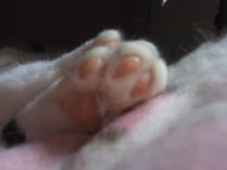 小さい頃から土の上を歩いた肉球は、やっぱり家猫のきれいなピンクとは違うなぁ。