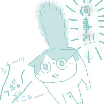 しっぽも膨らみ、耳も伏せて完全に『かかってこいやぁ~、こんにゃろ~』状態。