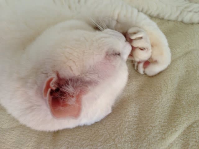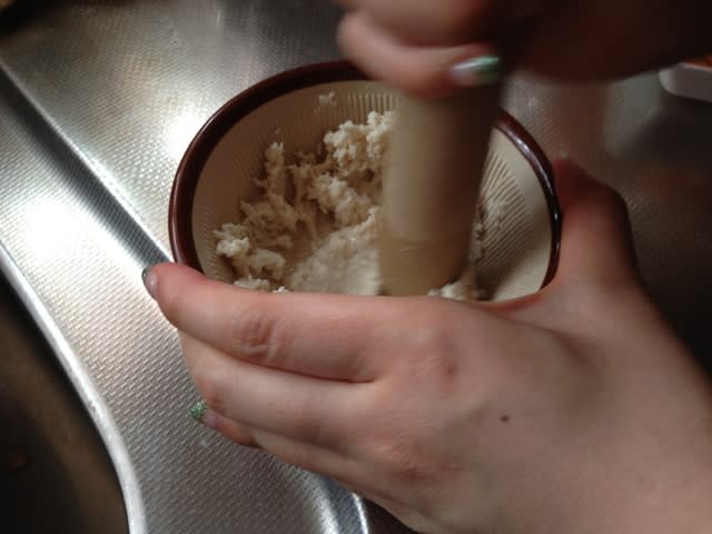 猫談議ささ身を茹でてすり鉢でゴリゴリ。