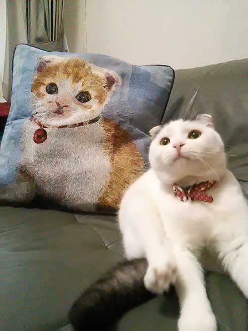 うちでご購入いただいたスコ柄のクッションとのツーショット。