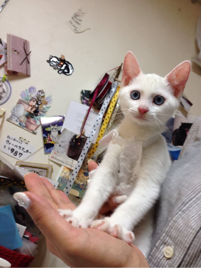 うちのお客様が気に入って宮城まで車を飛ばし、もらい受けに行って来た青い目の白猫みかんちゃん。