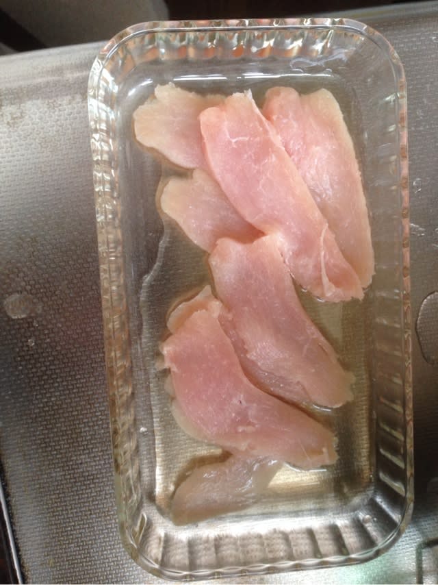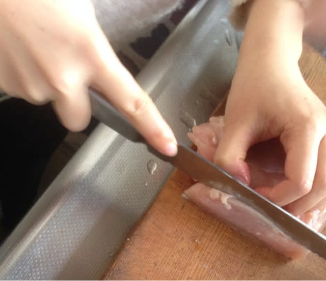 冷凍して切りやすくしたうめどりの胸肉を3~4ミリ厚さに切ります。