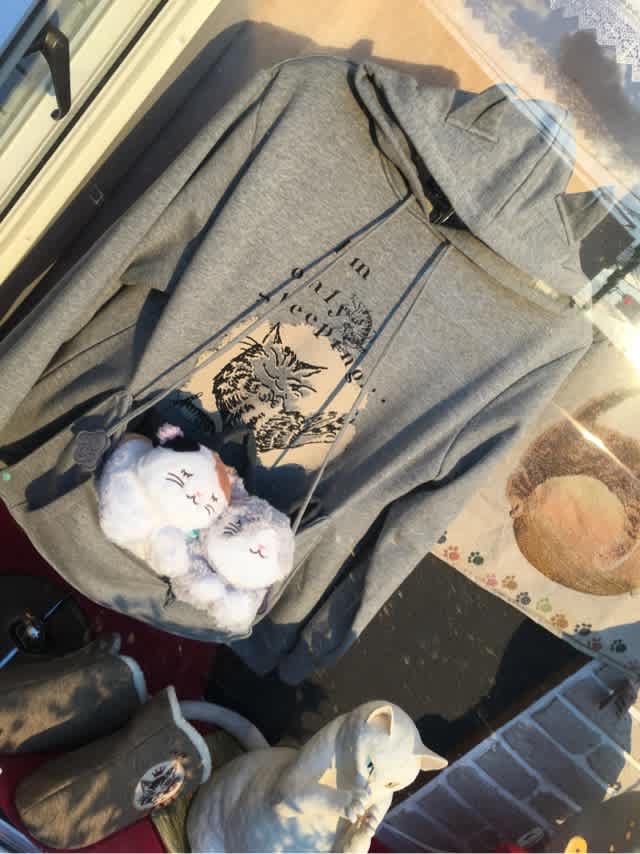 なんか、どっかの通販でみたような猫耳パーカー、おなかに猫を入れられるヤツ。