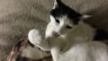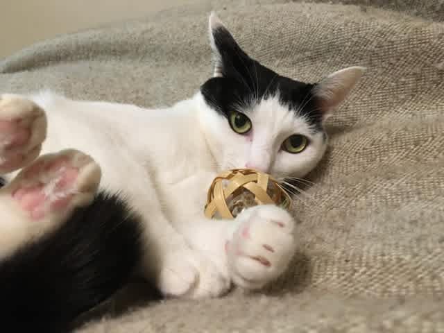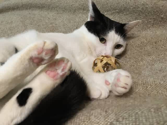 小さな竹かごの中に、マタタビの枝が入ったものと鈴が入ったものがあります。