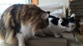 猫談議 にゃん相の悪い猫 ますこの爪とぎ(ますこにとっては、そうらしい…)にぐりこがずいずい近づいた。いややなぁ来るなよ…あっちけよー(目でコロス)雰囲気を察して離れるぐりこ、ほっとするますこ。ぐりこは内心、納得いかーんと思っているかも? 2016.05.03 猫談議