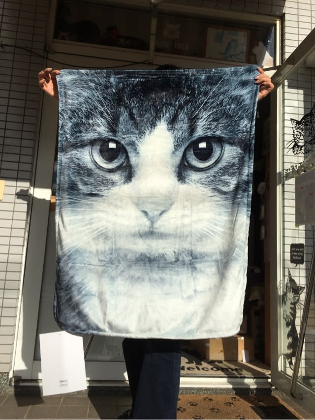 ぐりこ似の猫が大きくプリントされたふわふわブランケットです。