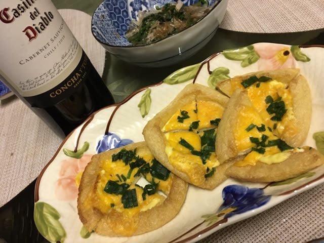 薄揚げの上にマヨネーズをクルクルっとしてチーズとねぎをのせてオーブンで焼くだけ。