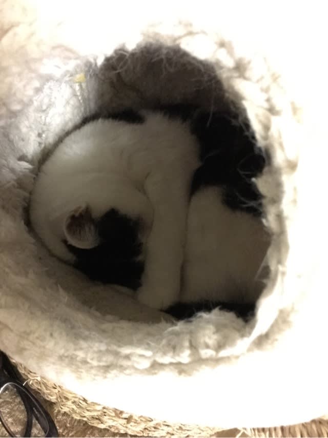 お気に入りの球体ベッドの中でぎゅっと丸まるますこしゃん。