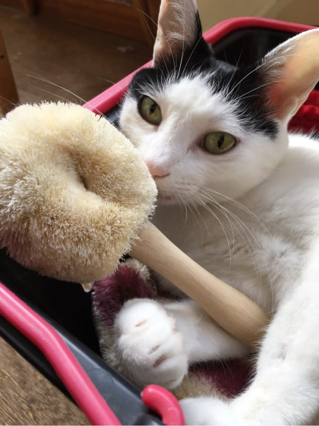 ますこはんは和歌山の職人が作った猫用ブラッシングたわし がお気に入り。