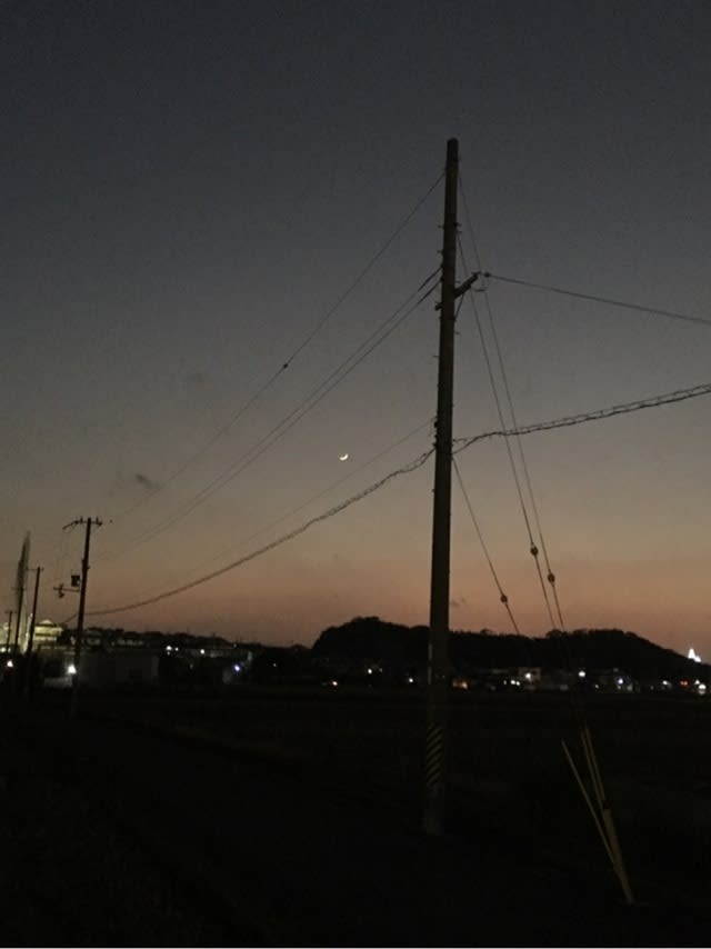 スマホじゃうまく写らないけれど、針のように細い、綺麗なお月さんでした。