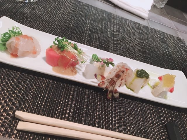 マトウ鯛の昆布〆、まぐろ、アオリイカ、車エビ、ほたて、シマアジ