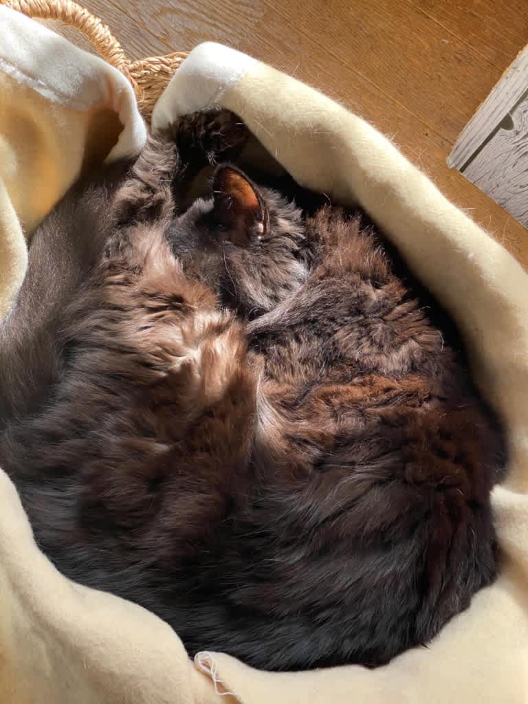 ひなたに置いたカゴの中で眠るKILIさん、穏やかでよろし。