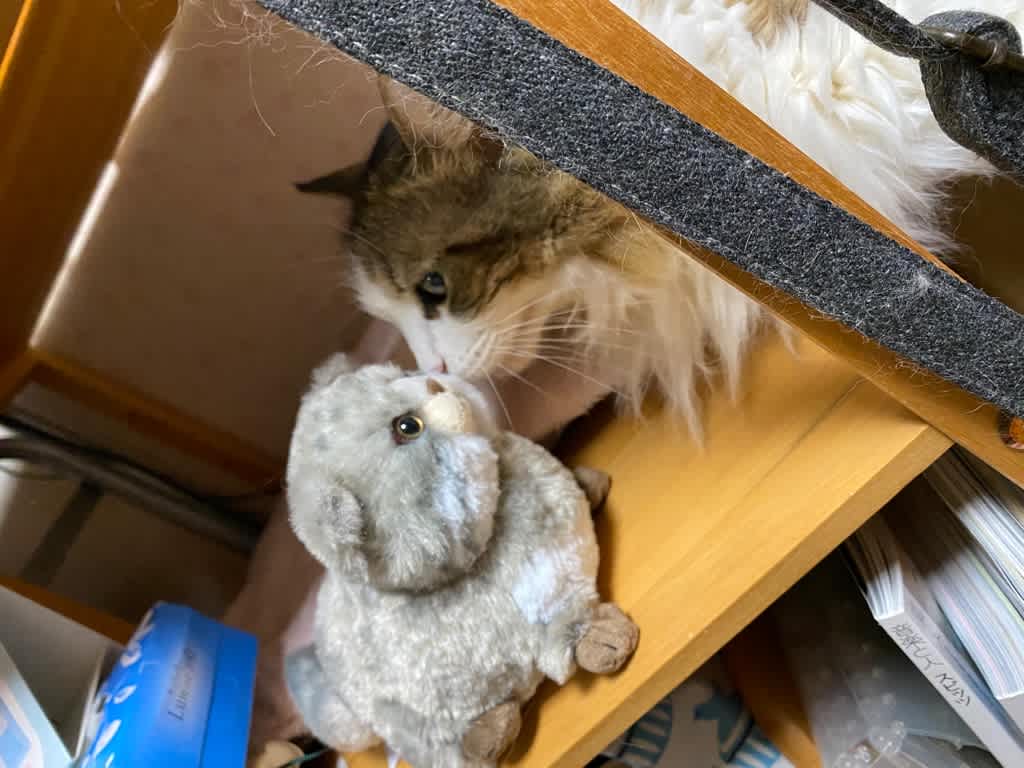 新商品のマヌルネコ、撮影の合間にぐりこがチュッ…