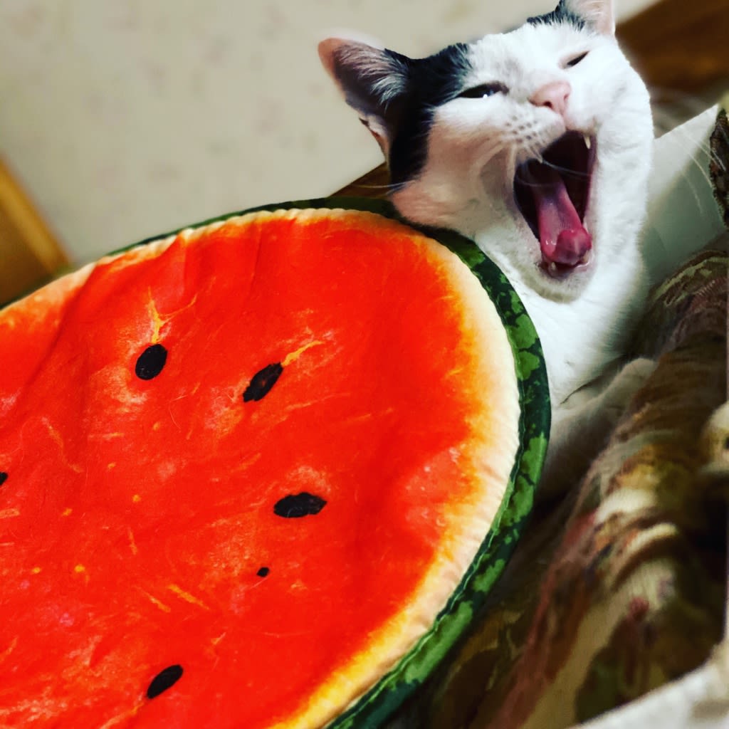 ますこは100均で買ってもらったすいかのクッションが気に入ったみたいですよ。