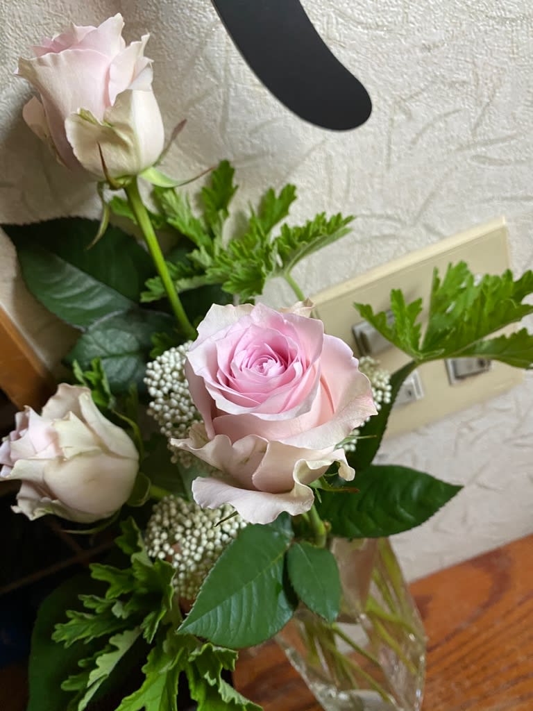 今日は綺麗な薔薇とライスフラワー、ローズゼラニウム。