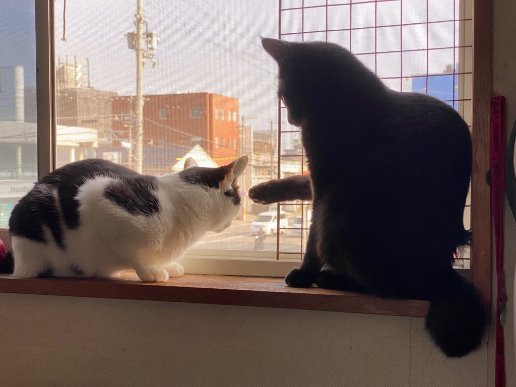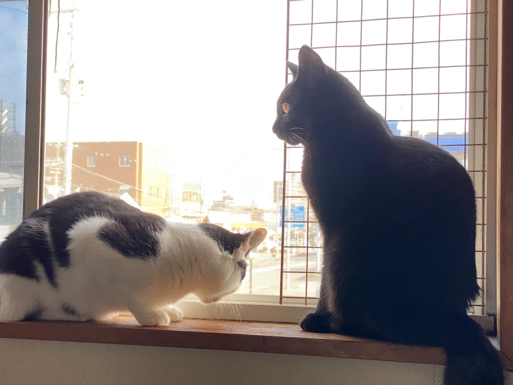朝のうちは涼しいので窓を開けると猫ーズが仲良く…?