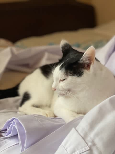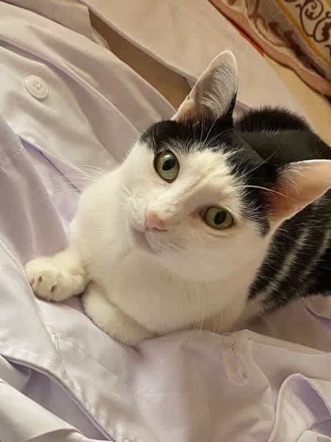 今朝も、アイロン掛けをするために置いた服の上にササッと乗ってくれる。