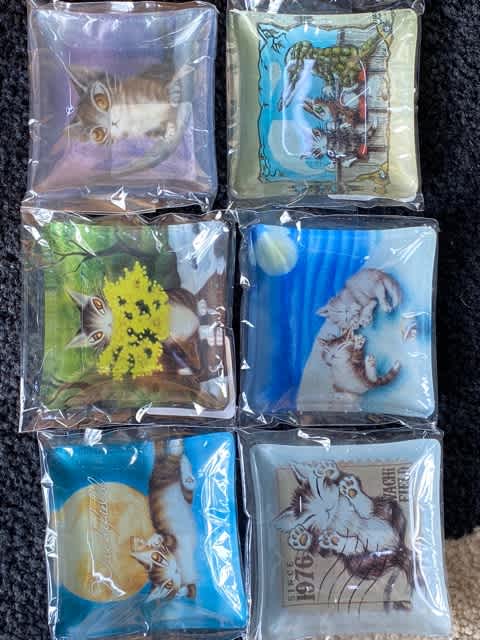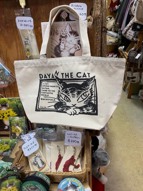 表面はミモザを抱えたダヤンの大きなプリント、裏面は同じを小柄に全面プリント。