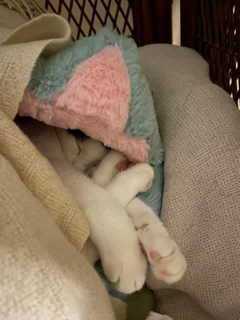 ベッドサイドにしつらえた【ますちゃんベッド】で爆睡ますこ。