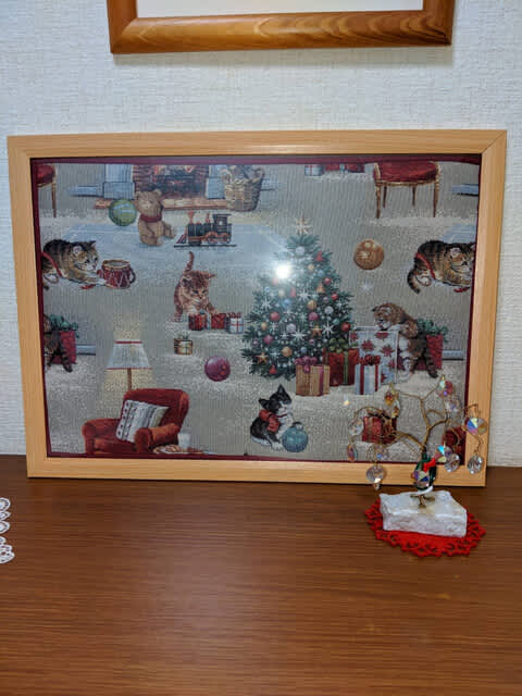 クリスマス柄のランチョンマットなのですが、こんな風に額に入れて玄関に。