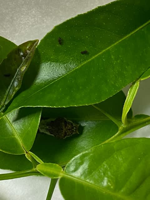 ちびアゲハーズたちのためにご近所さんの庭から柚子の葉っぱをもらってきたらこれまたアゲハの幼虫がくっついてた。