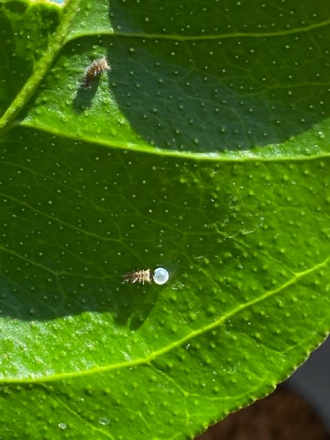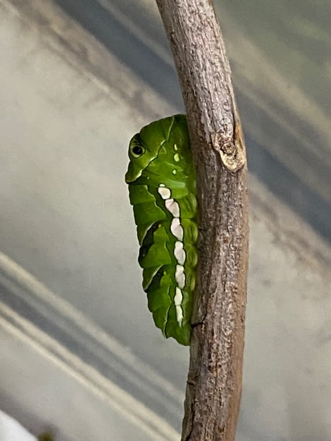 最初は糸くずみたいなのですがだんだん鳥のフンみたいな色に擬態して5回くらい脱皮していわゆる緑色の芋虫になります。