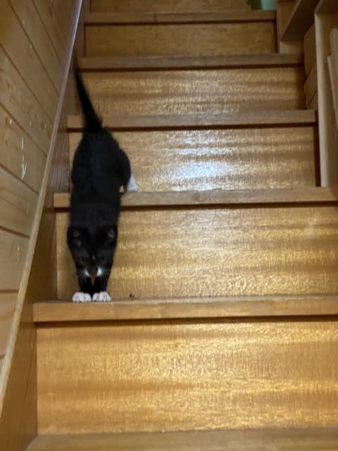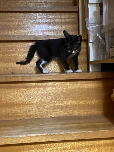 階段の上り下りも覚えた。前手の先だけ白くてかわいいな。