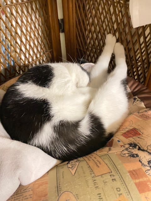 昨晩は冷えたので背中に湯たんぽで後ろ足シャキーンなますこさま。