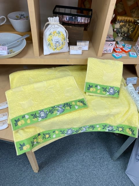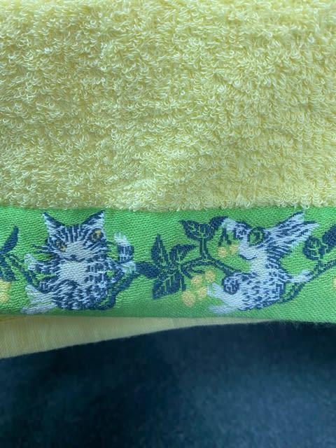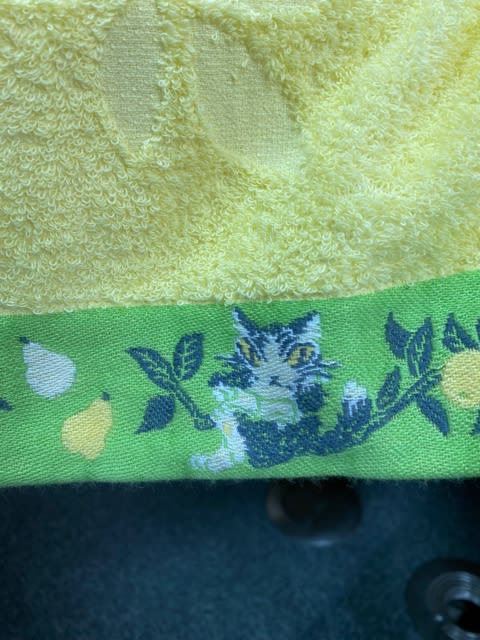 ミモザのタオルは地模様に猫顔が織り込まれているのとヘムのところにダヤン、マーシィ、ジタンがいるのがポイントですね。