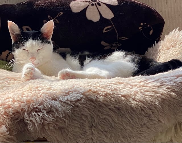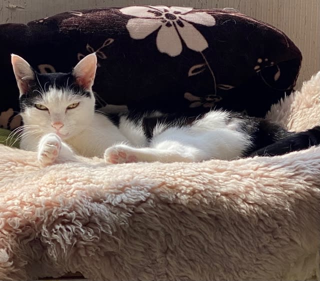 老猫もきっとそうなんだろうなぁ、と思うからうちのリビングはこんなに暖かい日でも石油ファンヒーターを点けています。