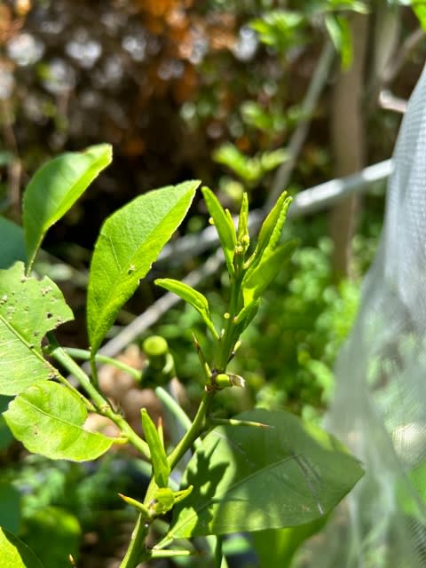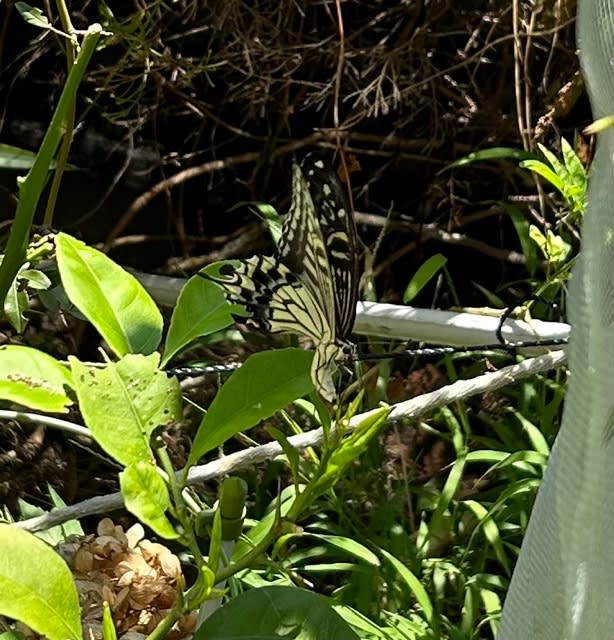 ふぃんふぃんふぃん~とアゲハが庭先に飛んできて網で覆ったレモンの木の横にそっと隠れている温州くんの鉢植えに…