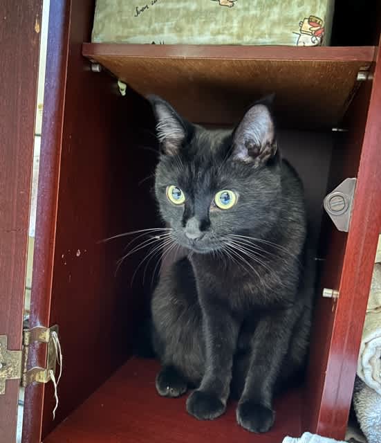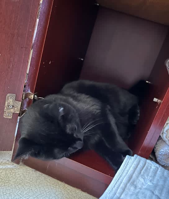 今日は何故か脱衣所の収納棚にはいりたがった、えびす。