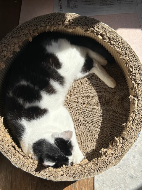 16歳になるますこさんは、もう寒いらしく日向に置いてある爪とぎで眠る。