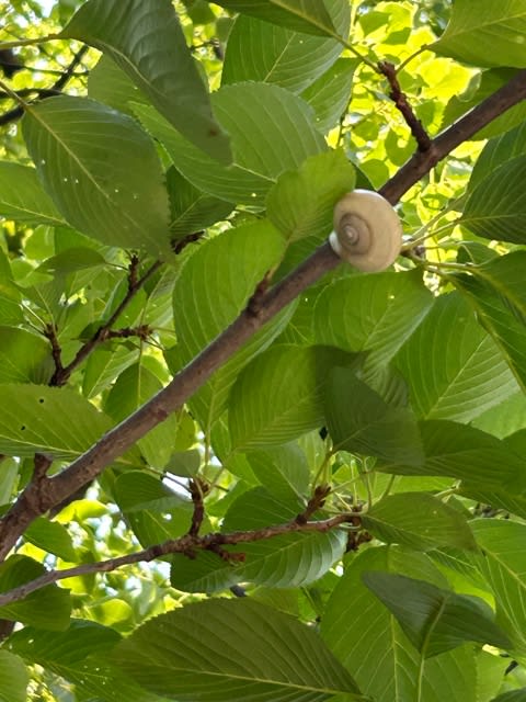 見上げた桜の枝にカタツムリ。