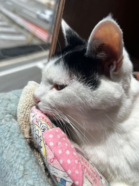 日光消毒しとき~というと賢く、日向ぼっこしています。